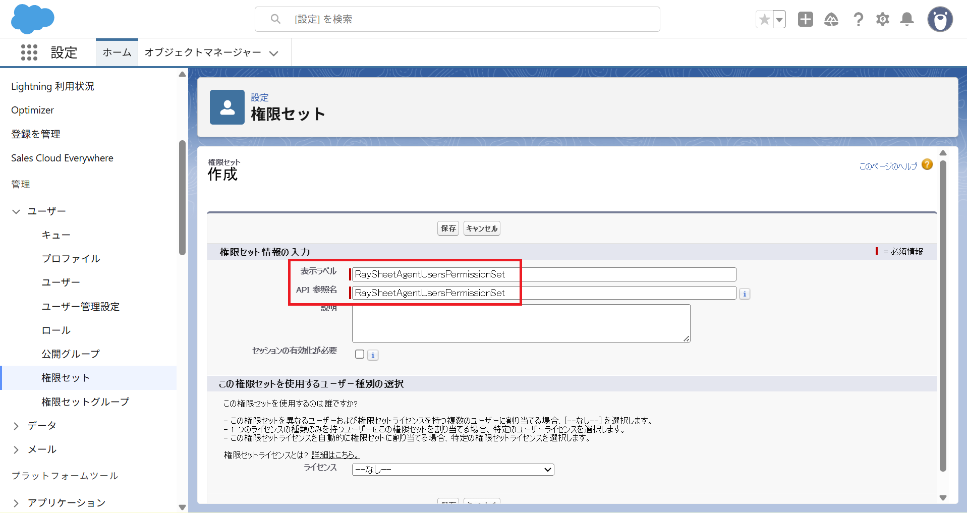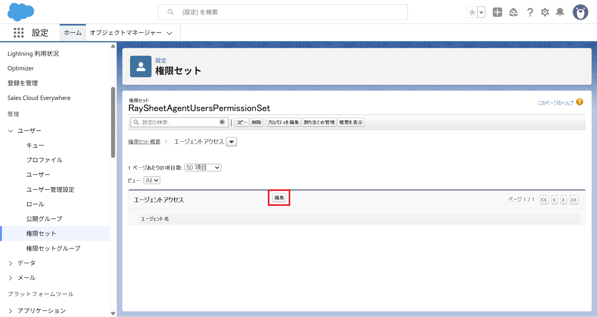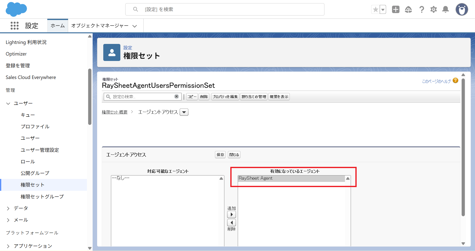 「作成したAgent」に対して権限セットを作成し、RaySheet Agentを利用するユーザーに権限セットを割り当てます。また、プロンプトテンプレート実行に必要な「プロンプトテンプレートユーザー」権限セットも割り当てます。