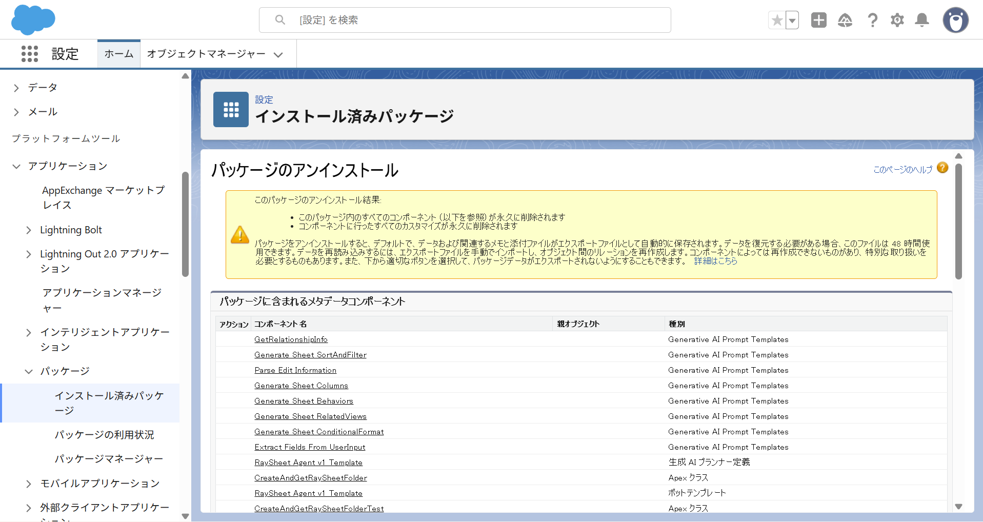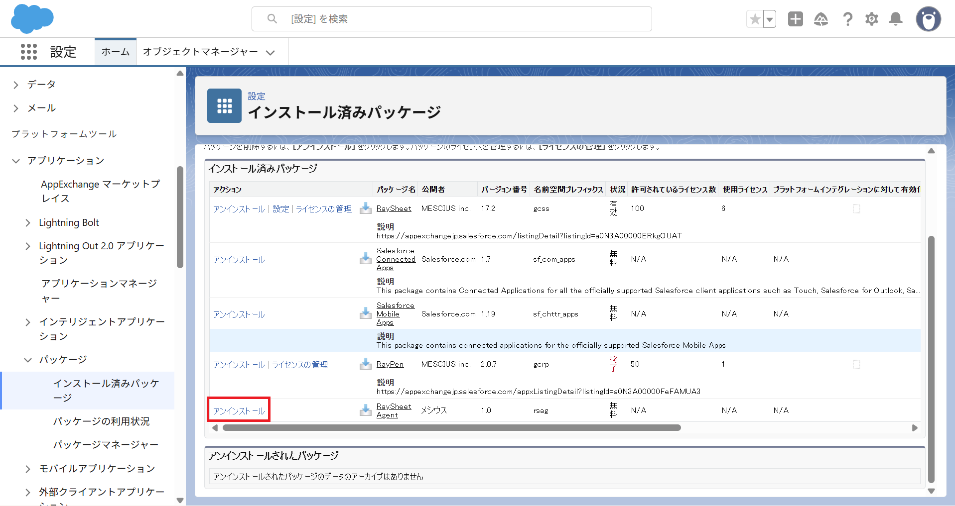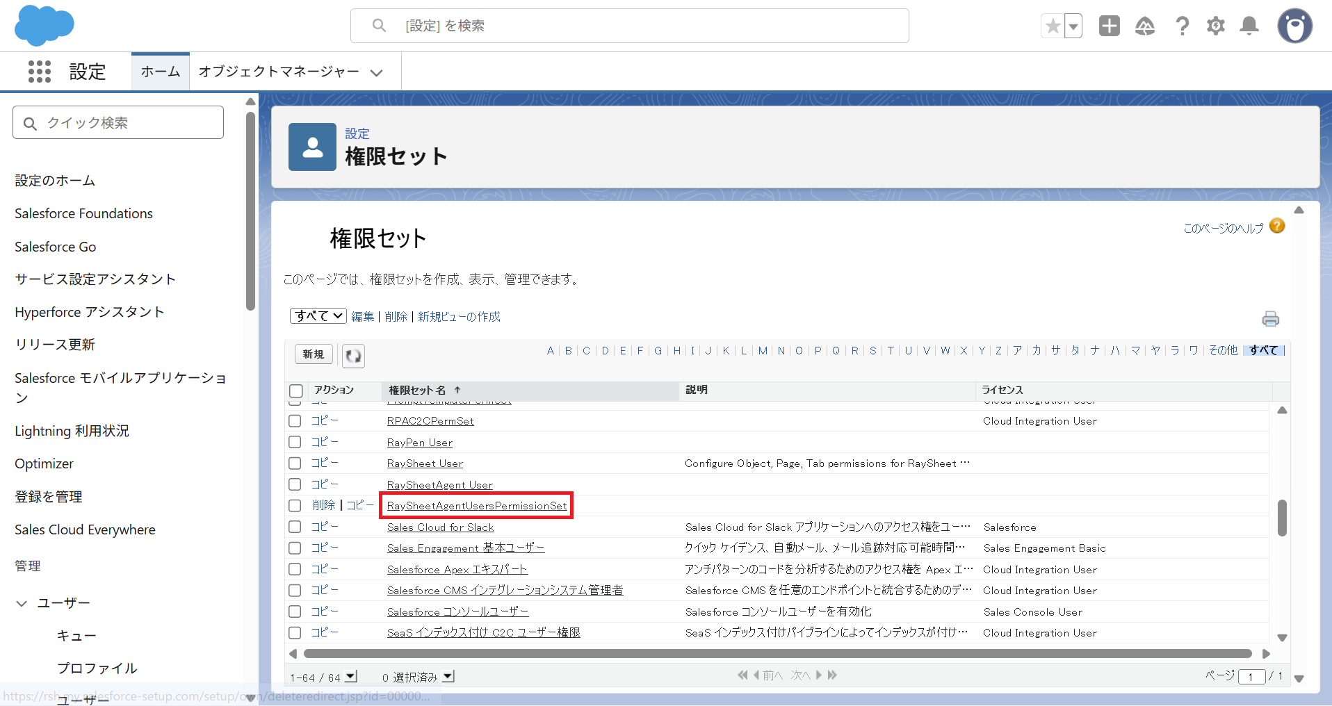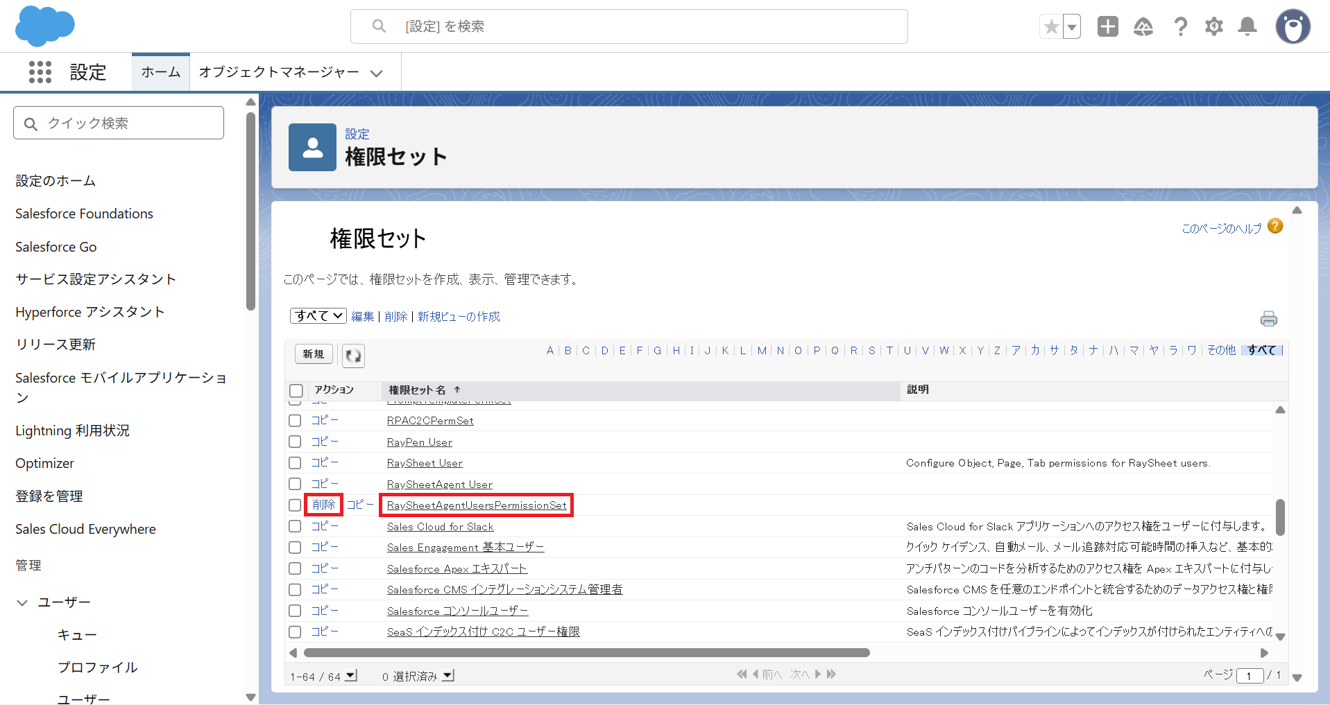 RaySheet Agentをアンインストールするためには、導入時に作成した「権限セット」と「Agent」を削除する必要があります。