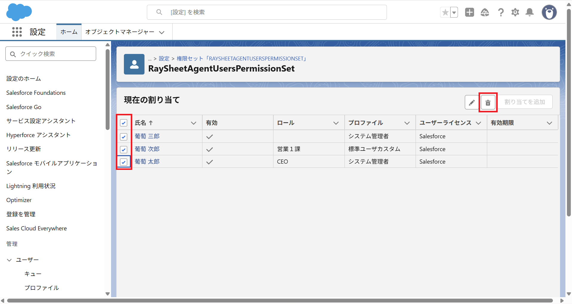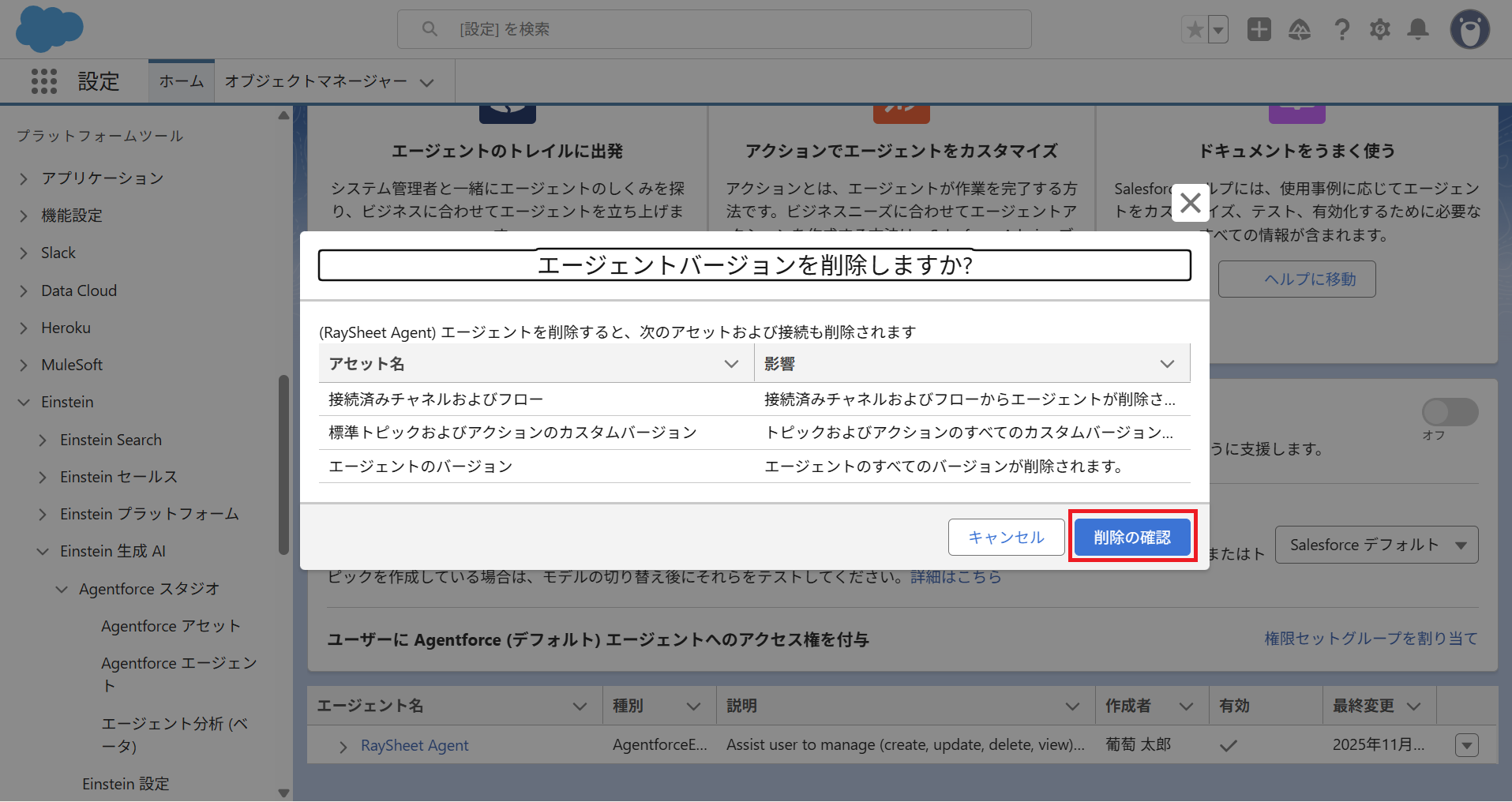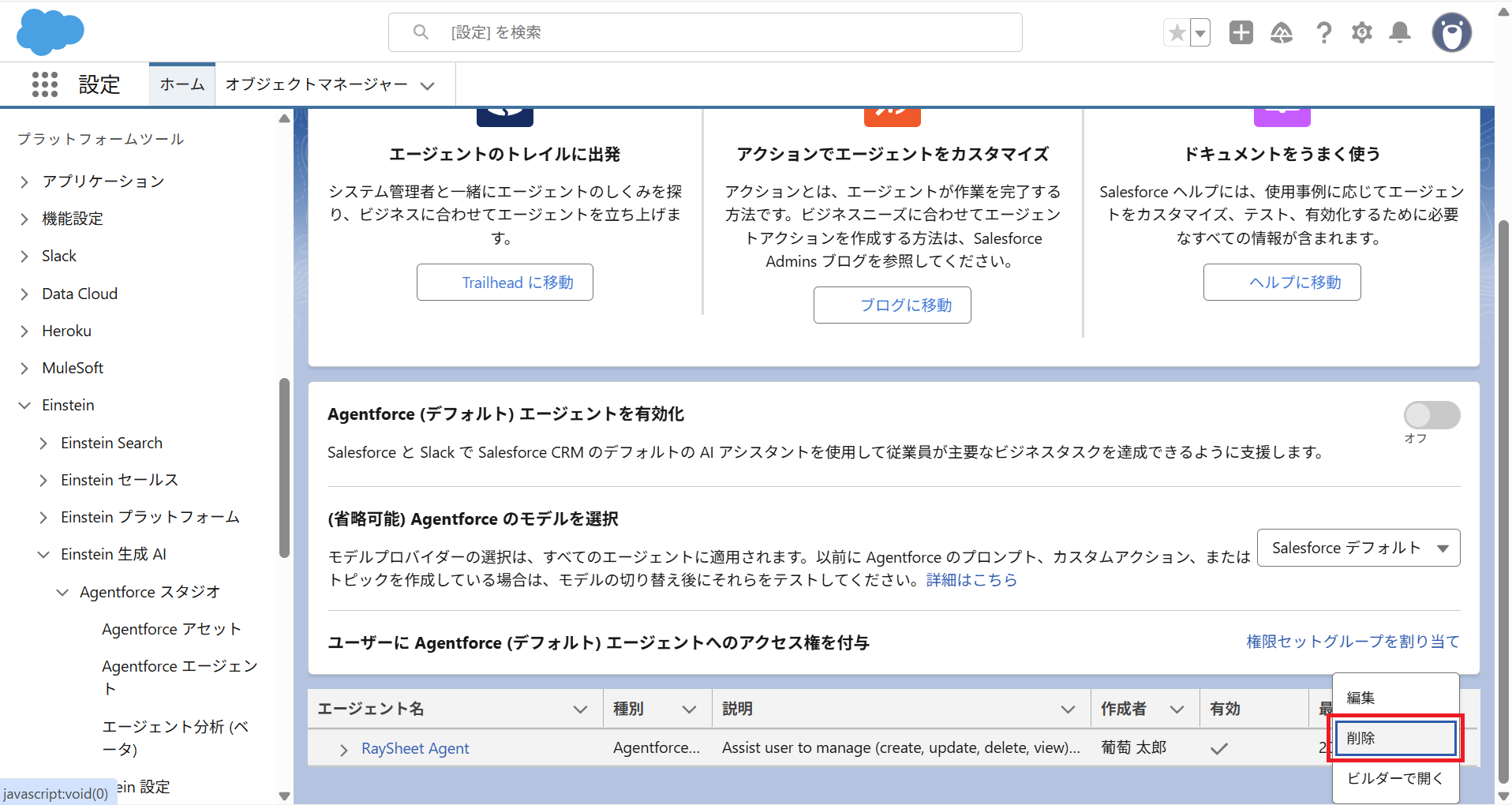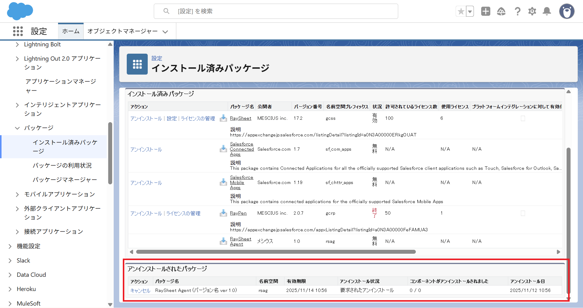 RaySheet Agentをアンインストールするためには、導入時に作成した「権限セット」と「Agent」を削除する必要があります。