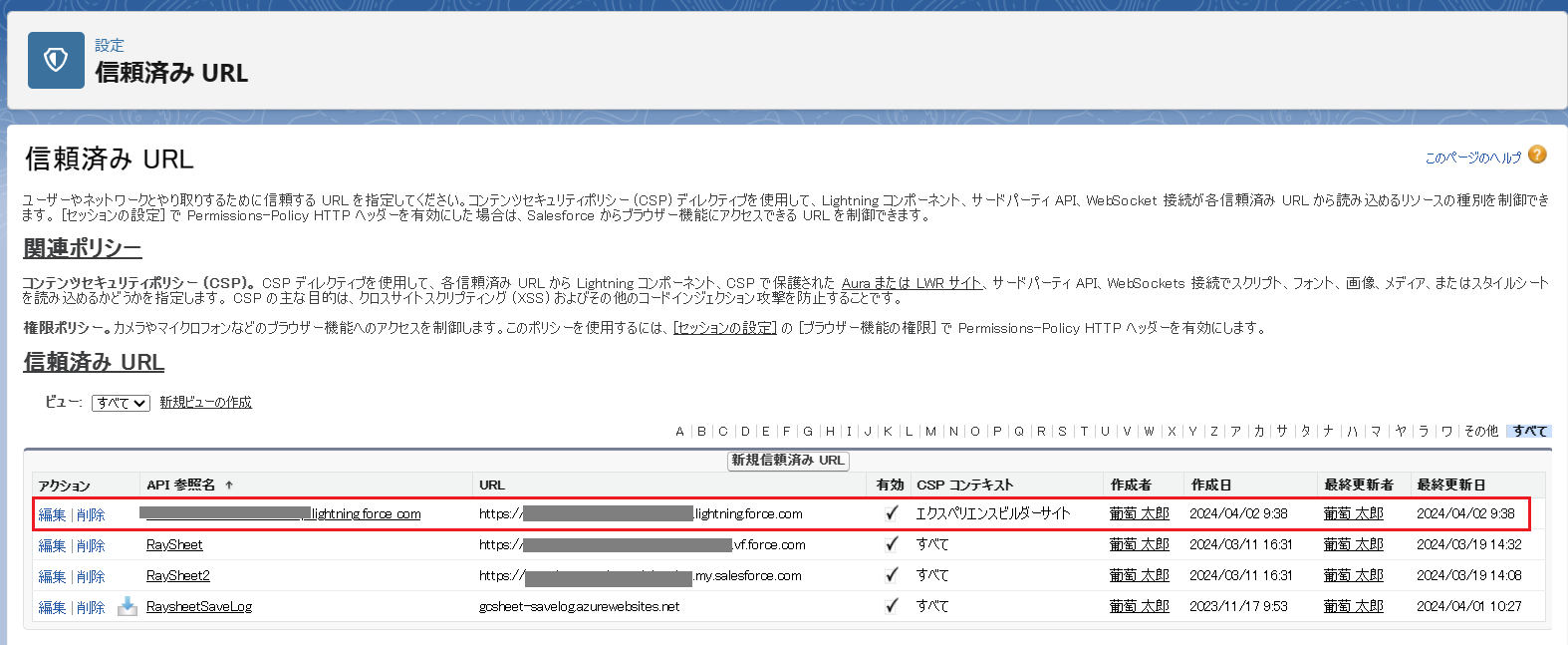 RaySheetPageのAura コンポーネントの場合は、以下2つのサイトを設定します。信頼済みURLは「設定 > セキュリティ > 信頼済み URL」から行います。