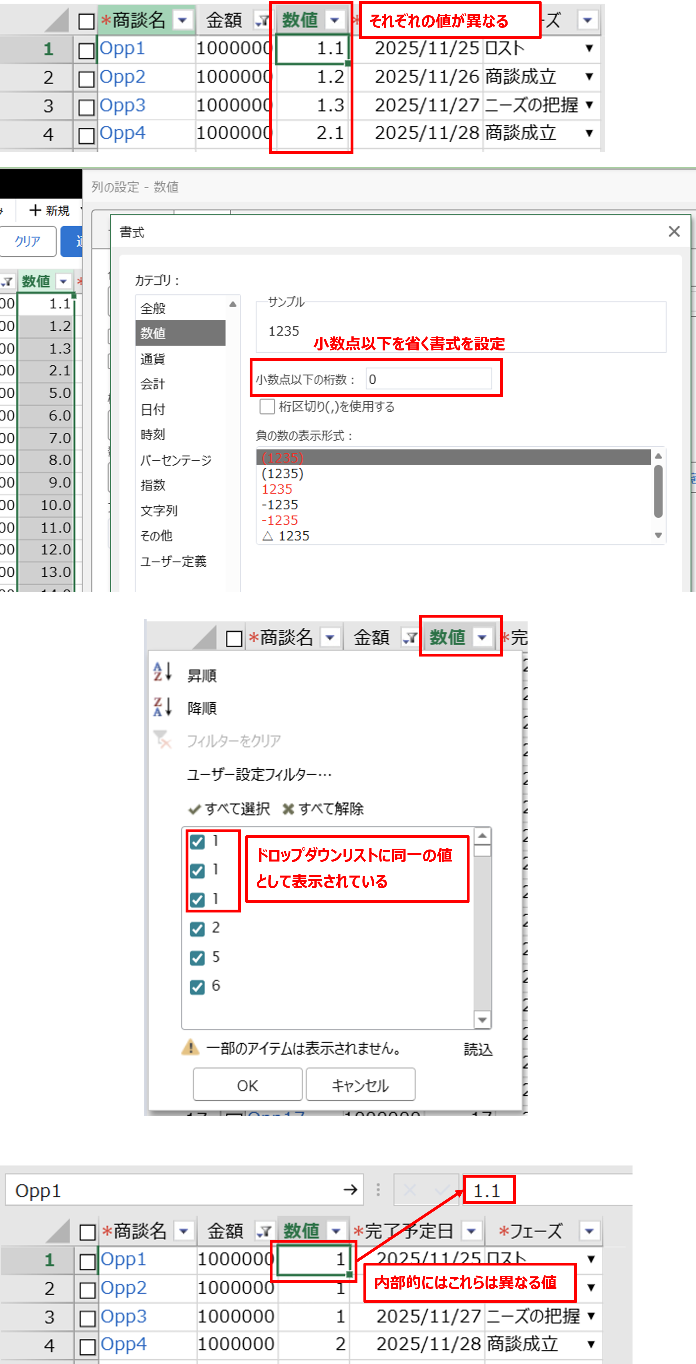 フィルターのドロップダウンリストに表示される件数は、「ドロップダウンリストの表示件数」で指定した件数までです。対象レコードがこの上限を超える場合は、「一部のアイテムは表示されません」というメッセージが表示され、ドロップダウンリストに表示されていないレコードは(その他)となります。 ※数値、通貨、日付、日付時刻の場合、(その他)は表示されません。