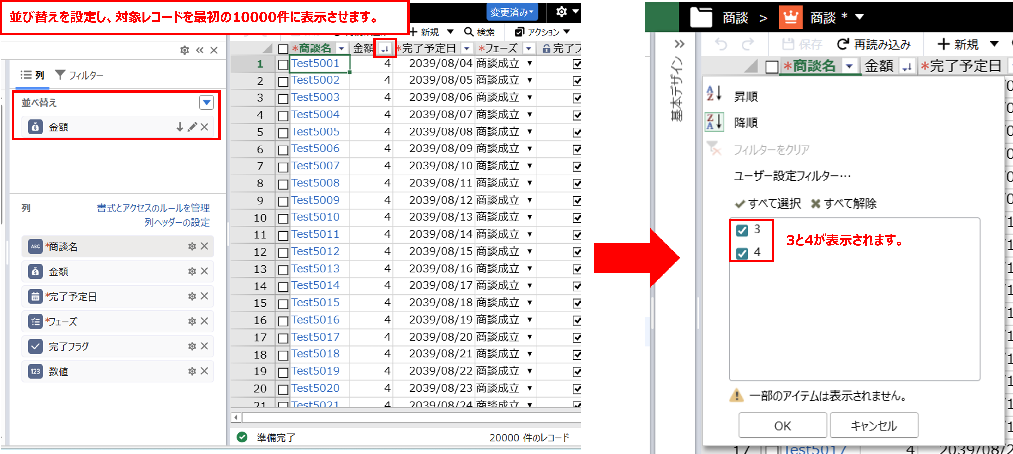 3と4を表示したい場合は、フィルター条件と並び替えを利用して、対象レコードを先頭10000件に表示させることを検討できます。
