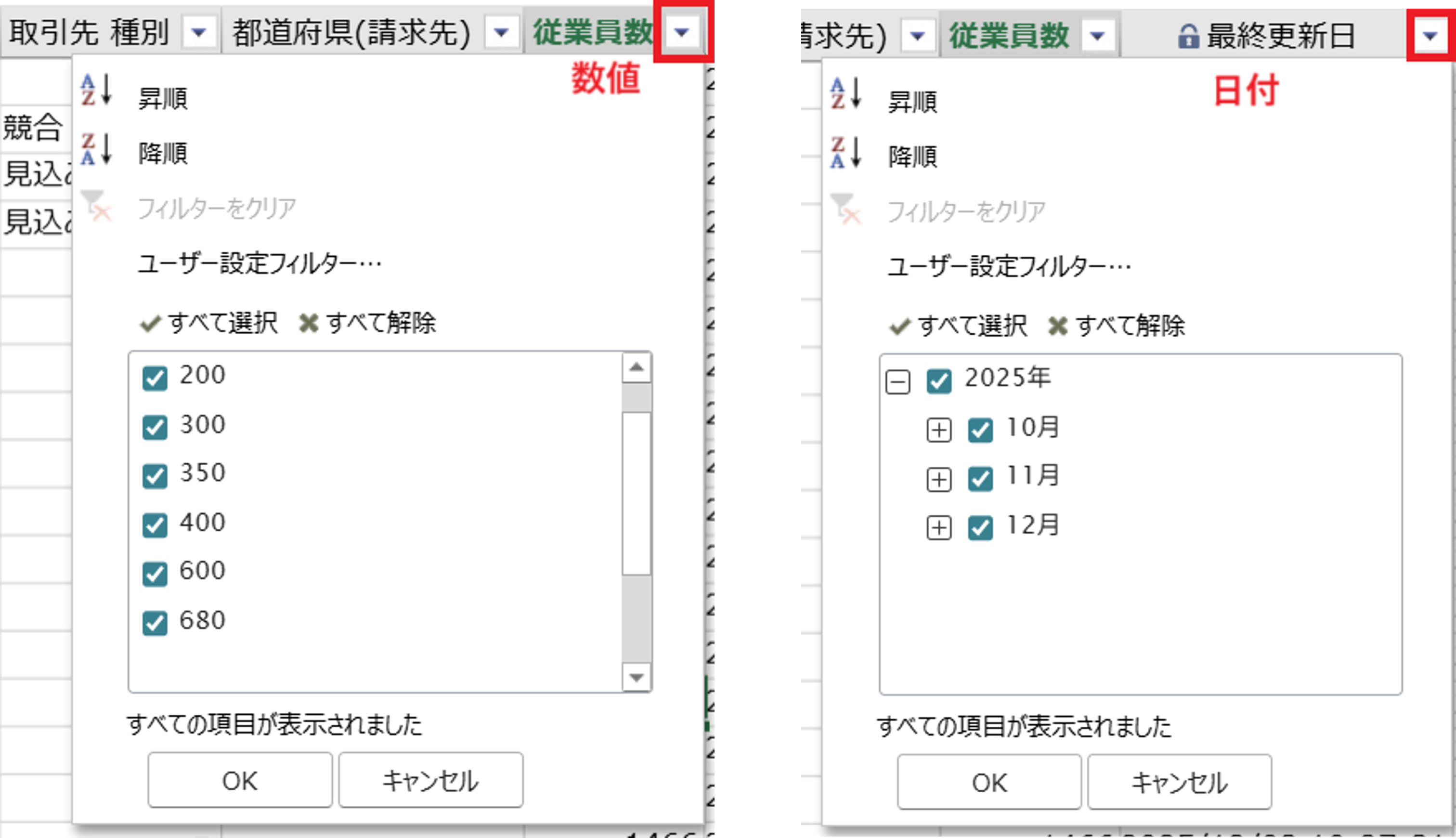フィルターのドロップダウンリストに表示されている項目について説明します。