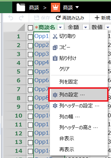 1.列の見出しを右クリックし、表示されるメニューから「列の設定…」をクリックする。