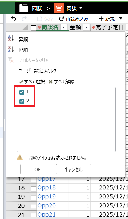 フィルターのドロップダウンリストに表示される件数は、「ドロップダウンリストの表示件数」で指定した件数までです。対象レコードがこの上限を超える場合は、「一部のアイテムは表示されません」というメッセージが表示され、ドロップダウンリストに表示されていないレコードは(その他)となります。 ※数値、通貨、日付、日付時刻の場合、(その他)は表示されません。