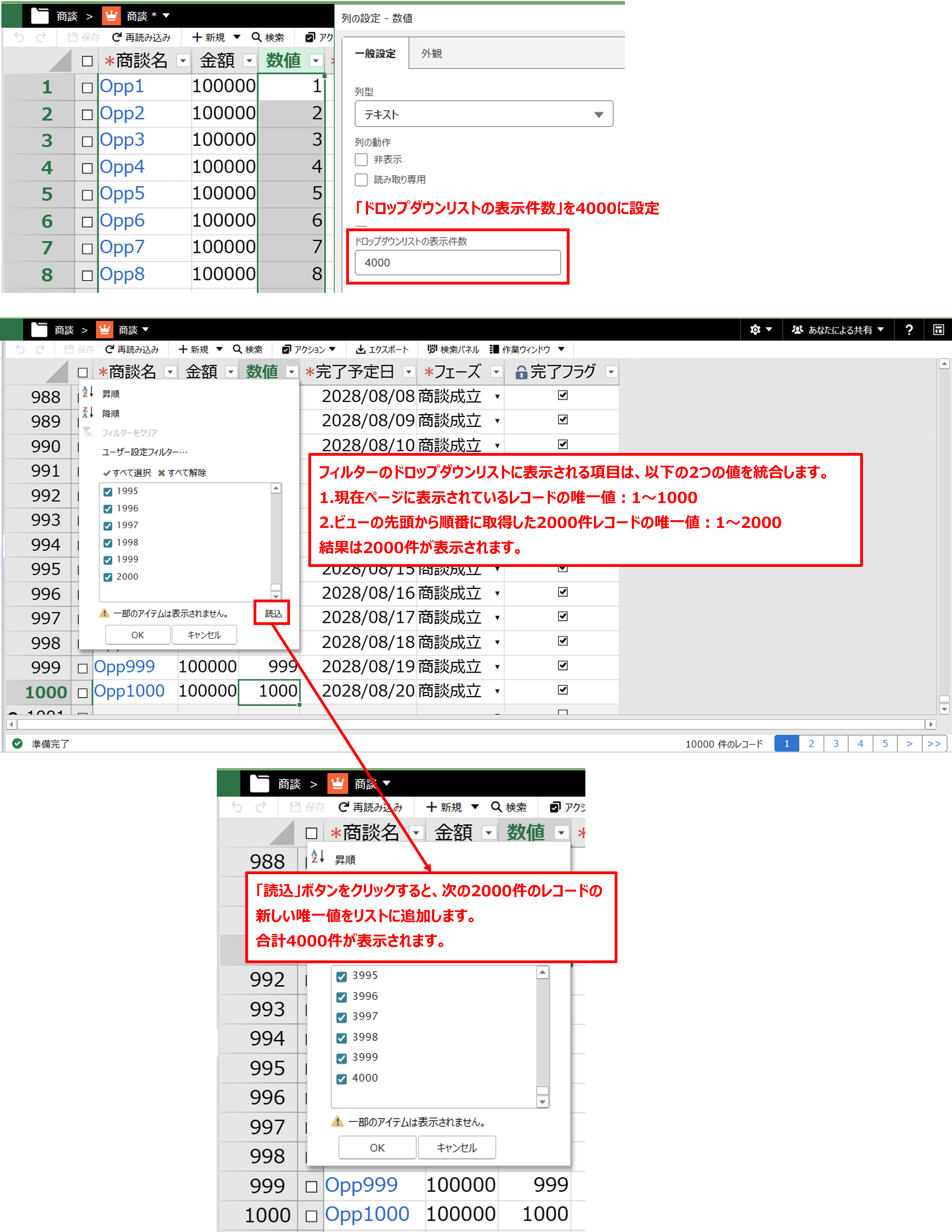 「読込」ボタンをクリックするたびに次の2000件のレコードの新しいユニークな値をドロップダウンリストに追加します。例えば、10000件のビューでページサイズを1000にしていた場合、一覧には1000レコードしか表示されませんが、フィルターのドロップダウンリストには2000件が表示され、「読込」ボタンをクリックすると、さらに2000件の新しいユニークな値が追加されます。