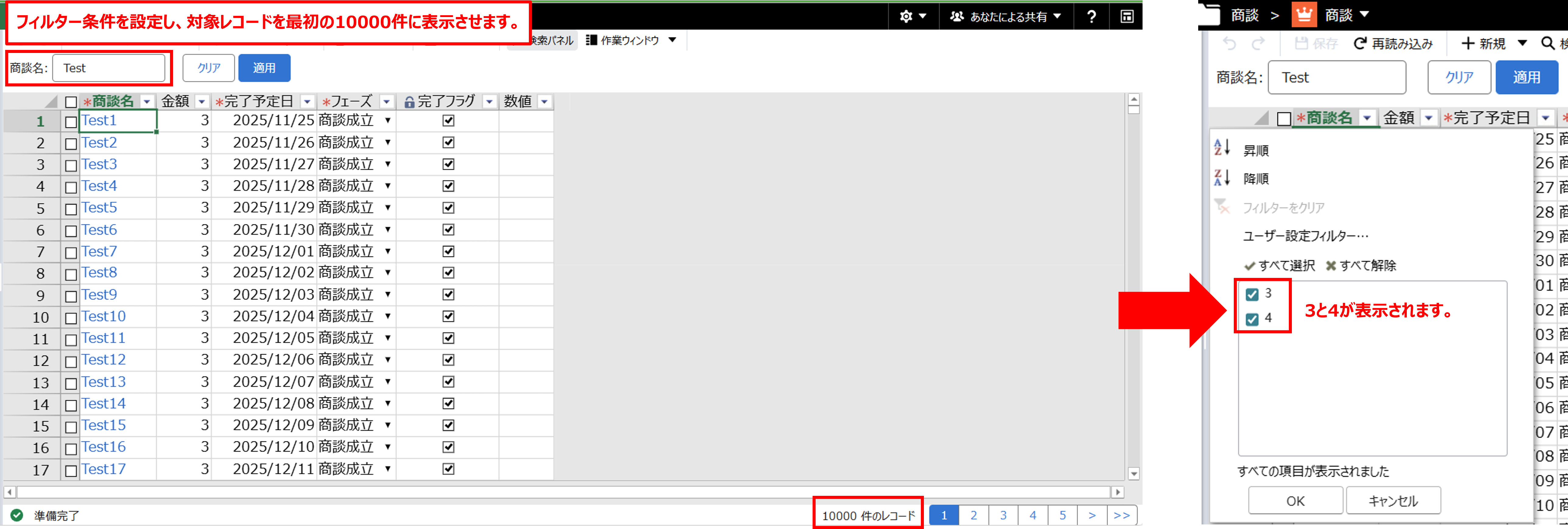 3と4を表示したい場合は、フィルター条件と並び替えを利用して、対象レコードを先頭10000件に表示させることを検討できます。
